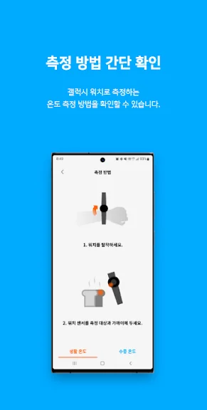 Samsung Galaxy Watch 5 이상의 모델과 연결된 "Thermo check"로 Wear OS 스마트워치를 이용해 온도를 측정하고, 모바일로 기록하세요.