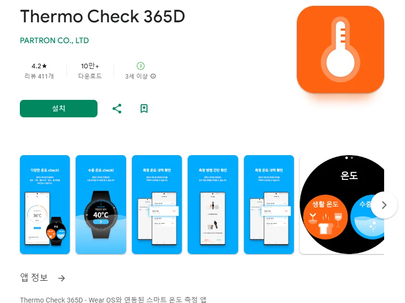 이 어플은 구글플레이스토어에서 "온도 측정"로 검색했을때 4번째로 나오는 어플입니다. 아래는 Thermo Check 365D 어플에 대한 자세한 설명이니 참고하세요.