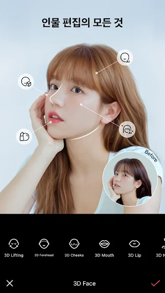 ・ 터치 보정, 3D 얼굴 보정, 좌우 각각 보정, 프리셋, 왜곡 펴기: 자연스럽고 디테일한 얼굴 보정