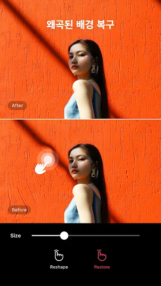 사진 전체에 적용하는 몸매 보정으로 원하는 부위만 전체적으로 늘리거나 줄일수 있어요. 위/아래, 좌/우 늘리기 줄이기 기능을 지원합니다.
